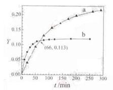 CH3COCH2COH(CH3)2(l)。 取等量CH3COCH3,分別在0℃和20℃下,測(cè)得其轉(zhuǎn)化分?jǐn)?shù)隨時(shí)間變化的關(guān)系曲線(Y-t)如下圖所示。下列說(shuō)法正確的是![]()