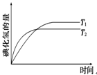 2HI(g),在溫度T1和T2時,產(chǎn)物的量與反應時間的關(guān)系如右下圖所示。則符合圖示的正確判斷是![]()