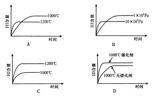 2HI(g),△H<0,該反應(yīng)是一個(gè)可逆反應(yīng)。若反應(yīng)物起始物質(zhì)的量相同,下列關(guān)于該反應(yīng)的示意圖正確的是![]()
