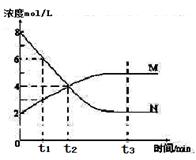 在一定溫度下,固定容積的容器內(nèi)某一反應(yīng)中M、N的物質(zhì)的量濃度隨反應(yīng)時(shí)間變化的曲線如右圖所示:![]()