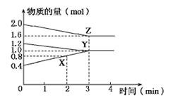 某溫度時(shí),在容積為2L的密閉容器中,X、Y、Z三種氣體物質(zhì)的物質(zhì)的量隨時(shí)間的變化曲線如圖所示,根據(jù)圖中數(shù)據(jù),填空:(4分)![]()