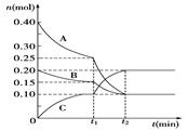 (7分)現(xiàn)將0.40 mol A氣體和0.20 mol B氣體充入10 L的密閉容器中,在一定條件下使其發(fā)生反應(yīng)生成氣體C,其物質(zhì)的量的變化如圖:![]()