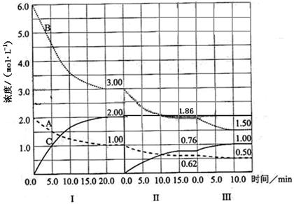 (16分)在一個固定體積的密閉容器中發(fā)生某反應,當改變其他反應條件,在I、II、III階段,體系中各物質濃度隨時間變化的曲線如下圖所示:![]()