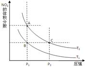2NO2(g) △H>0 ,在溫度為T1、 T2時(shí),平衡體系中NO2的體積分?jǐn)?shù)隨壓強(qiáng)變化曲線如圖所示。T1 T2(填“>”、“<”或“=”);A、C兩點(diǎn)的速率vA vC(同上)。![]()