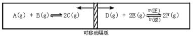 在一個(gè)容積固定的反應(yīng)器中,有一可左右滑動(dòng)的密封隔板,兩側(cè)分別進(jìn)行如下圖所示的可逆反應(yīng)。各物質(zhì)的起始加入量如下:A、B和C均為4.0 mol,D為6.5 mol,F(xiàn)為2.0 mol,設(shè)E為x mol。當(dāng)x在一定范圍內(nèi)變化時(shí),均可以通過調(diào)節(jié)反應(yīng)器的溫度,使兩側(cè)反應(yīng)都達(dá)到平衡,并且隔板恰好處于正中位置。請(qǐng)?zhí)顚懸韵驴瞻祝?br />![]()