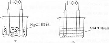 一化學(xué)興趣小組在家中進(jìn)行化學(xué)實(shí)驗(yàn),按照圖甲連接好線路發(fā)現(xiàn)燈泡不亮,按照圖乙連接好線路發(fā)現(xiàn)燈泡亮,由此得出的結(jié)論正確的是 ( )![]()