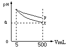 pH=11的x、y兩種堿溶液各5mL,分別稀釋至500mL,其pH與溶液體積(V)的關(guān)系如圖所示。![]()