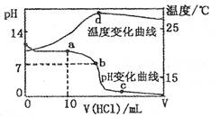 室溫下,將1.00mol ? L-1鹽酸滴人20. OO mL 1.OOmol ? L-1的氨水中,溶液pH和溫度隨加入鹽酸體積的變化曲線如下圖所示。![]()