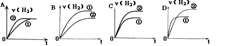 體積相同、C(H+)相同的某一元強酸溶液①和某一元弱酸溶液②分別與足量的鋅粉發(fā)生反應(yīng),下列關(guān)于氫氣體積(V)隨時間(t)變化的示意圖正確的是( )![]()