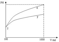 pH=2的兩種一元酸x和y,體積均為100ml,稀釋過程中pH與溶液體積的關(guān)系如圖13圖所示.分別滴加NaOH溶液(c=0.1mol/L)至pH=7,消耗NaOH溶液體積為Vx、Vy,則![]()