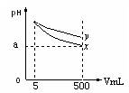 pH=11的x、y兩種堿溶液各5mL,分別稀釋至500mL,其pH與溶液體積(V)的關(guān)系如圖所示,下列說(shuō)法正確的是![]()