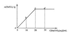常溫下,向0.1mol·L-1的硫酸溶液中逐滴加入物質(zhì)的量濃度相同的氫氧化鋇溶液,生成沉淀的量與加入氫氧化鋇溶液的體積關(guān)系如下圖所示,下列有關(guān)說法中正確的是 ( )![]()