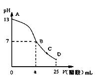 25 ℃時(shí),在25 mL 0.1 mol·L-1的NaOH溶液中,逐滴加入0.2 mol·L-1的CH3COOH溶液,溶液的pH與醋酸體積關(guān)系如圖所示,下列分析正確的是 ![]()