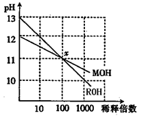 MOH和ROH兩種堿的溶液分別加水稀釋時(shí),pH變化如圖所示。下列敘述中正確的是( )![]()
