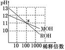 兩種一元堿MOH和ROH的溶液分別加水稀釋,溶液pH的變化如圖所示,下列敘述不正確的是![]()