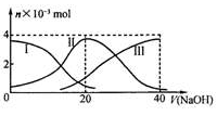 常溫下,向20 mL 0.2 mol/L H2A溶液中滴加0.2 mol/L NaOH溶液。有關微粒的物質(zhì)的量變化如下圖(其中I代表H2A,II代表HA-,III代表A2-)。根據(jù)圖示判斷,下列說法正確的是![]()