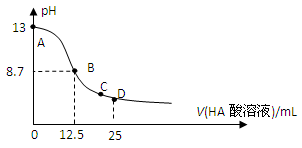 25℃時(shí),在25mL 0.1mol/L NaOH溶液中逐滴加入0.2mol/L HA酸溶液,溶液pH變化曲線如下圖所示,仔細(xì)觀察下圖,判斷有關(guān)說法中不正確的是( )![]()