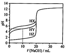 25℃時,用濃度為0.1000 mol·L-1的NaOH溶液滴定20.00 mL濃度均為0.1000 mol·L-1的三種酸HX、HY、HZ滴定曲線如圖所示。![]()