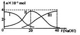 常溫下,向20 mL 0.2 mol/L H2A溶液中滴加0.2 mol/L NaOH溶液。有關(guān)微粒物質(zhì)的量變化如下圖(其中I代表H2A,II代表HA-,III代表A2-)。根據(jù)圖示判斷下列說法正確的是![]()
