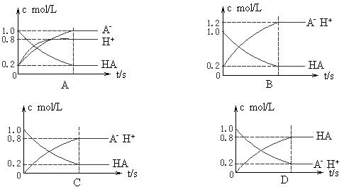 H++A-,如圖將1.0 mol HA分子加入1.0 L水中,溶液中HA、H+、A-的物質(zhì)的量濃度隨時(shí)間而變化的曲線正確的是![]()