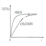 (1)25℃時,將20mL 0.10 mol·L-1 CH3COOH溶液和20mL 0.10 mol·L-1HSCN溶液分別與20mL 0.10 mol·L-1NaHCO3溶液混合,實驗測得產(chǎn)生的氣體體積(V)隨時間(t)變化的示意圖為圖所示:反應初始階段,兩種溶液產(chǎn)生CO2氣體的速率存在明顯差異的原因是 ,反應結(jié)束后所得兩溶液中,c(CH3COO-) c(SCN-)(填“>”、“<”或“=”)