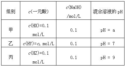 (每空3分,共12分)常溫下,將3種一元酸分別和NaOH溶液等體積混合,實(shí)驗(yàn)數(shù)據(jù)如下:![]()