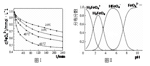 (3)將適量K2FeO4配制成c(FeO42-) =1.0 mmol·L-1的試樣,將試樣分別置于20℃、30℃、40℃和60℃的恒溫水浴中,測定c(FeO42-)的變化,結(jié)果見圖Ⅰ。第(1)題中的反應(yīng)為FeO42-變化的主反應(yīng),則溫度對該反應(yīng)的反應(yīng)速率和平衡移動的影響是 ;發(fā)生反應(yīng)的△H 0(填“>”、“<”或“=”)。![]()