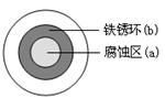 將NaCl溶液滴在一塊光亮清潔的鐵板表面上,一段時間后發(fā)現(xiàn)液滴覆蓋的圓周中心區(qū)(a)已被腐蝕而變暗,在液滴外沿形成棕色鐵銹環(huán)(b),如圖所示。導致該現(xiàn)象的主要原因是液滴之下氧氣含量比邊緣少。下列說法正確的是( )![]()