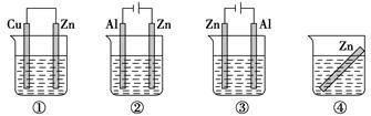 下列各裝置中都盛有0.1 mol·L-1的NaCl溶液,放置一定時間后,裝置中的四塊相同的鋅片,腐蝕速率由快到慢的正確順序是(D )![]()
