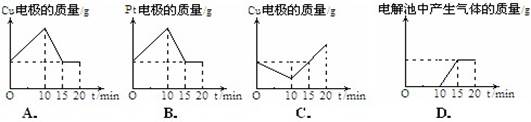 將質(zhì)量相等的銅片和鉑片插入硫酸銅溶液中,銅片與電源正極相連鉑片與電源負(fù)極相連,以電流強度1A通電10min,然后反接電源,以電流強度2A繼續(xù)通電10min。下列表示銅電極.鉑電極.電解池中產(chǎn)生氣體的質(zhì)量和電解時間的關(guān)系圖正確的是![]()