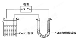 下圖中a、b是惰性電極,通電2 min后b電極附近溶液呈紅色,b電極生成標(biāo)準(zhǔn)狀況時(shí)的氣體體積為2.24L,NaCl溶液體積為500 mL,下列說(shuō)法不正確的是![]()