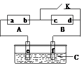 下圖A為直流電源,B為浸泡過飽和氯化鈉溶液和酚酞試液的濾紙,C為電鍍槽。接通電路以后發(fā)現(xiàn)B上的c點顯紅色。為實現(xiàn)鐵上鍍鋅,接通K后,使c、d兩點短路。下列敘述正確的是( )![]()