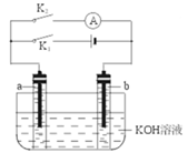 如圖所示,a、b是多孔石墨電極,某同學(xué)按圖示裝置進行如下實驗:斷開K2,閉合K1一段時間,觀察到兩支玻璃管內(nèi)都有氣泡將電極包圍,此時斷開K1,閉合K2,觀察到電流計A的指針有偏轉(zhuǎn)。下列說法不正確的是( )![]()