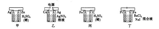 | C.丙中H+向碳棒方向移動 | D.丁中電解開始時陰極產(chǎn)生黃綠色氣體 |