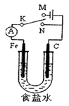 | A.若電鍵K與N連接,鐵被保護不會腐蝕 |