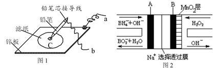 圖1是在金屬鋅板上貼上一張用某溶液浸濕的濾紙,圖2是NaBH4/H2O2燃料電池,則下列說法正確的是![]()