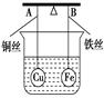 如圖所示,杠桿A、B兩端分別掛有體積相同、質(zhì)量相同的空心銅球和空心鐵球調(diào)節(jié)杠桿使其在水中保持平衡,然后小心地向燒杯中央滴入濃CuSO4溶液,一段時間后,下列有關(guān)杠桿的偏向判斷正確的是(實驗過程中不考慮鐵絲反應(yīng)及兩邊浮力的變化)
