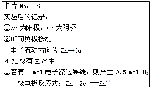 如圖所示是Zn和Cu構(gòu)成的原電池,某實(shí)驗(yàn)興趣小組做完實(shí)驗(yàn)后,在讀書卡片上做了一些記錄。在卡片上,描述合理的是( )
