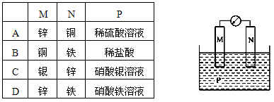 下圖所示裝置中,觀察到電流計(jì)指針偏轉(zhuǎn),M棒變粗,N棒變細(xì),由此判斷下表中所列M、N、P物質(zhì),其中可以成立的是( )![]()