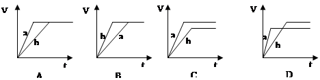 等質(zhì)量的兩份鋅粉a和b,分別加入過量的稀硫酸中,并向a中加入少量CuSO4溶液,下圖表示產(chǎn)生H2的體積(V)與時(shí)間(t)的關(guān)系正確的是 ( ) ![]()