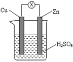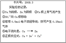 如圖甲把鋅片和銅片用導(dǎo)線相連后插入稀硫酸溶液構(gòu)成原電池。某實(shí)驗(yàn)興趣小組做完實(shí)驗(yàn)后,在讀書卡上的記錄如圖乙所示,則卡片上的描述合理的是