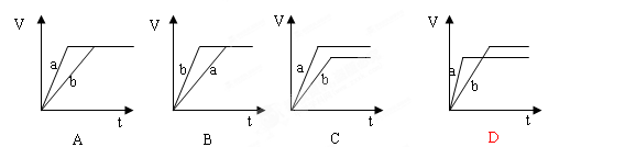 等質(zhì)量的兩份鋅粉a和b,分別加入過(guò)量的稀硫酸中,并向a中加入少量CuSO4溶液,下圖表示產(chǎn)生H2的體積(V)與時(shí)間(t)的關(guān)系正確的是 ![]()