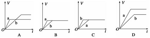 將等質(zhì)量的兩份鋅粉a、b分別加入過(guò)量的稀硫酸,同時(shí)向a中加少量CuSO4溶液,下圖中產(chǎn)生H2的體積V(L)與時(shí)間t(min)的關(guān)系,其中正確的是![]()