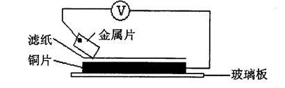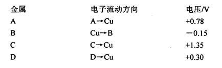 將潔凈的金屬片A、B、C、D分別放置在浸有某種鹽溶液的濾紙上面并壓緊(如圖所示)。在每次實(shí)驗(yàn)時(shí),記錄電壓指針的移動(dòng)方向和電壓表的讀數(shù)如下:![]()