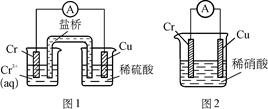 工業(yè)上常將鉻鍍在其他金屬表面,同鐵、鎳組成各種性質(zhì)的不銹鋼,在下圖裝置中,觀察到圖1裝置銅電極上產(chǎn)生大量的無色氣泡,而圖2裝置中銅電極上無氣體產(chǎn)生,鉻電極上產(chǎn)生大量有色氣體,則下列敘述正確的是![]()