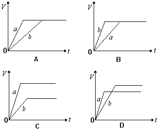 等質量的兩份鋅粉a、b,分別加入過量的稀H2SO4,同時向a中加入少量的CuSO4溶液,下列圖表示產(chǎn)生H2的體積(V)與時間(t)的關系,其中正確的是:( )![]()