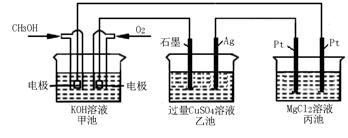 如下圖所示,其中甲池的總反應(yīng)式為:2CH3OH+3O2+4KOH=2K2CO3+6H2O![]()