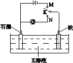 | B.K與N連接時,X為氯化鈉,石墨電極反應(yīng):2H++2e- = H2↑ |