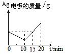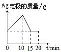 將質(zhì)量相等的Ag片和鉑片插入硝酸銀溶液(足量)中,銀片與電源正極相連,鉑片與電源負極相連。以電流強度1A通電10min,然后反接電源,以電流強度2A繼續(xù)通電10min。下列為表示銀電極的質(zhì)量、鉑電極的質(zhì)量、電解池中產(chǎn)生氣體的質(zhì)量和電解時間的關(guān)系圖,正確的是