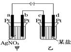 如圖所示的裝置,通電一段時間后,測得甲池中某電極質量增加2.16 g,乙池中某電極上析出0.24 g某金屬,下列說法正確的是![]()